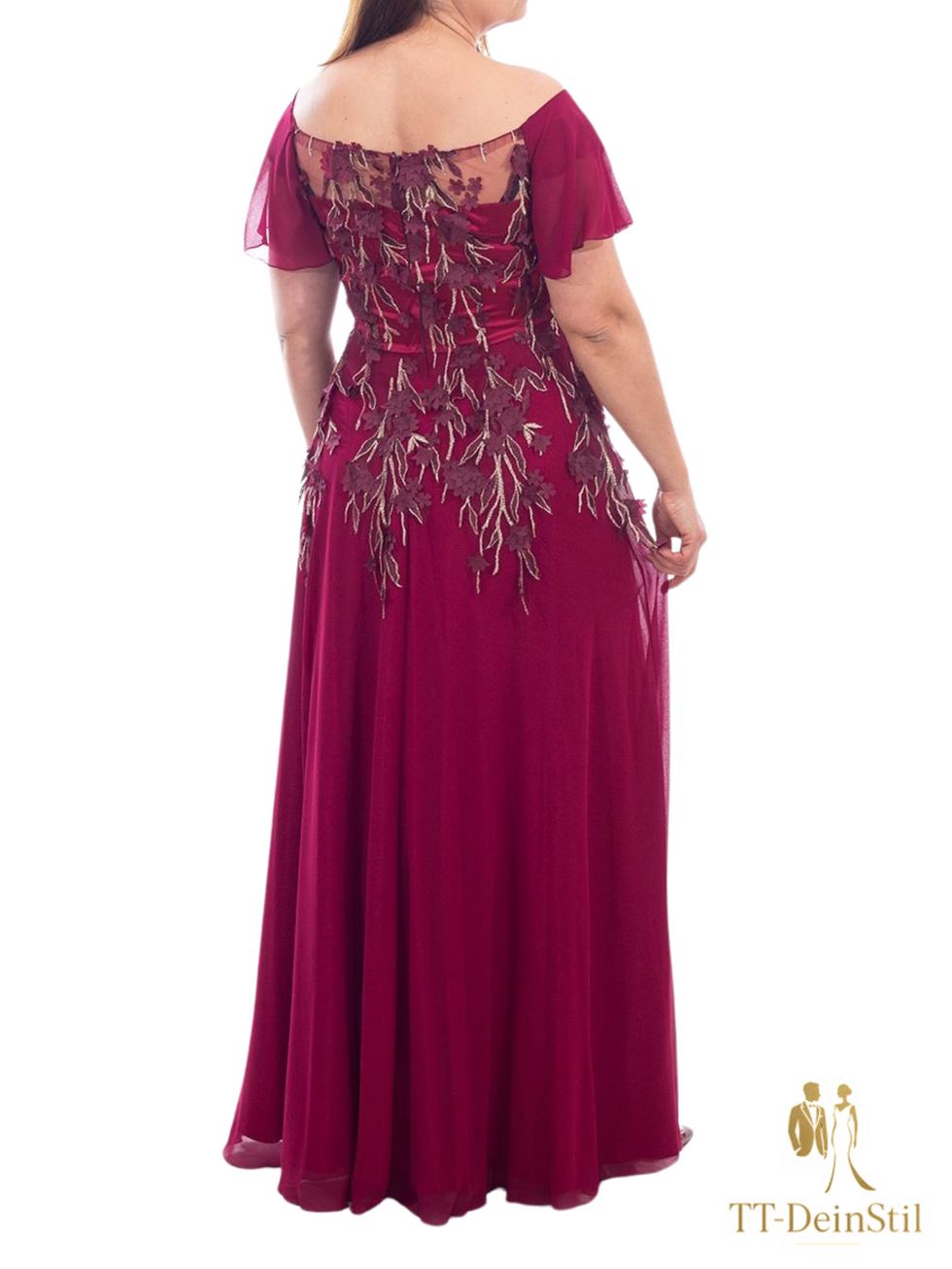 Dieses atemberaubende Abendkleid in sattem Bordeaux vereint klassische Eleganz mit raffinierten Details. Das Oberteil ist kunstvoll mit floraler Stickerei und zarten Applikationen versehen, die dem Kleid eine luxuriöse Ausstrahlung verleihen. Die transparente Schulterpartie und die locker fallenden, kurzen Chiffonärmel sorgen für eine stilvolle Leichtigkeit.