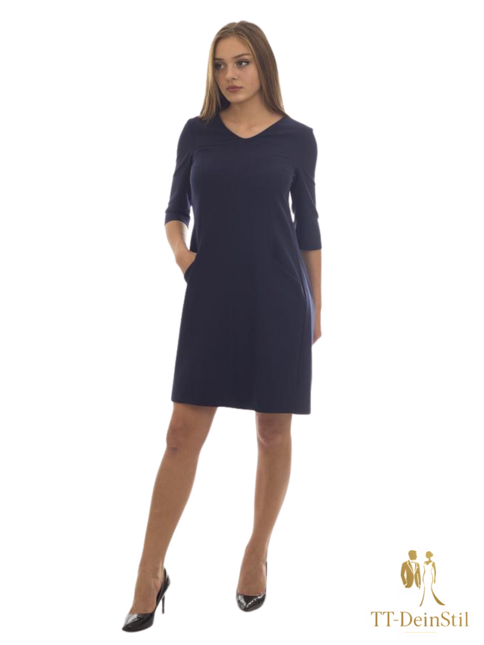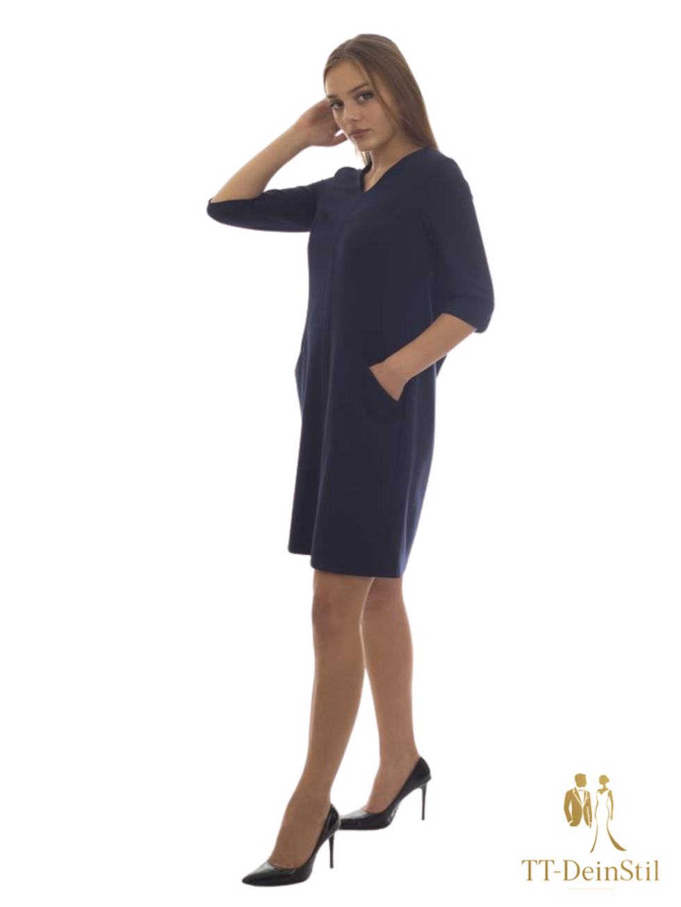Dieses minimalistische Etuikleid in edlem Dunkelblau ist ein echter Allrounder für stilvolle Auftritte im Alltag und im Büro. Der lockere, gerade Schnitt mit knieumspielender Länge sorgt für hohen Tragekomfort, während der dezente V-Ausschnitt und die 3/4-Ärmel dem Design eine elegante Note verleihen.